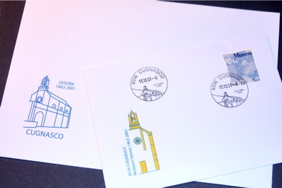Timbro postale commemorativo per il restauro della chiesa Gesora, busta filatelica e busta per la Parrocchia